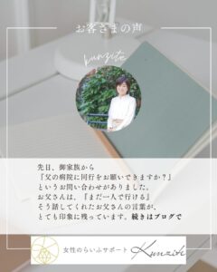 「お仕事が休めない」「一人では不安」そんなご家族に代わってつきそいます。