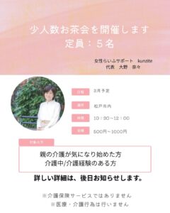 ②ご家族の介護に不安を感じている方を対象とした介護カフェを開催しております。専門家や同じ境遇の方とお話しすることで、気持ちが軽くなったり今後の見通しがたつかもしれません。ご参加お待ちしています。